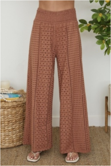 HIGH RISE EYELET WIDE LEG PANT - CAMEL