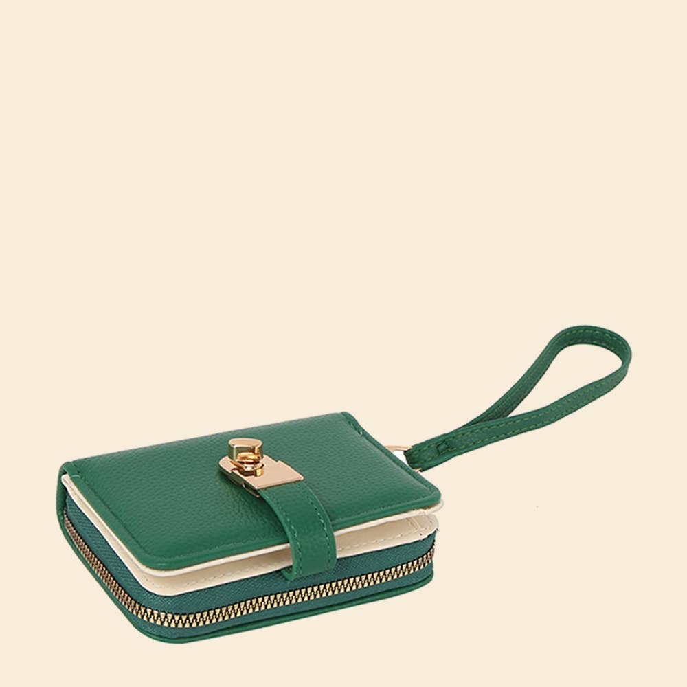 Unleash the potential of your wardrobe with this versatile wallet, ensuring a touch of elegance in every ensemble. This wallet features an exceptional twist lock flap wristlet design. Made of vegan leather with a turn-lock closure in gold-tone.
