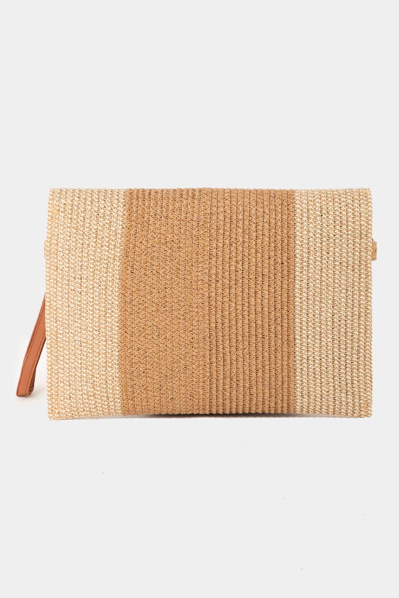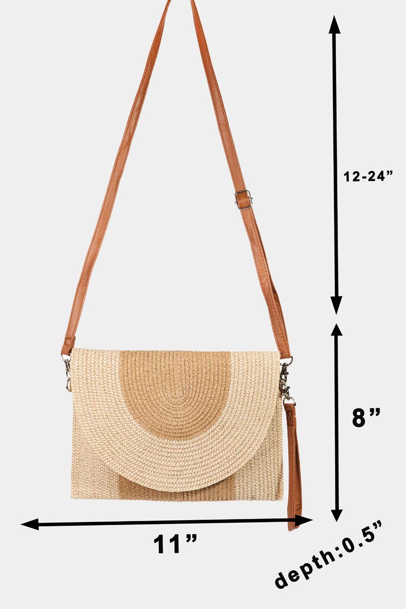 Elevate your summer ensembles with this chic, timeless accessory. This clutch bag brings a luxurious two tone straw style and converts to crossbody with the included strap. Measures approximately: 11" L x 8" H. Made of 100% Paper.